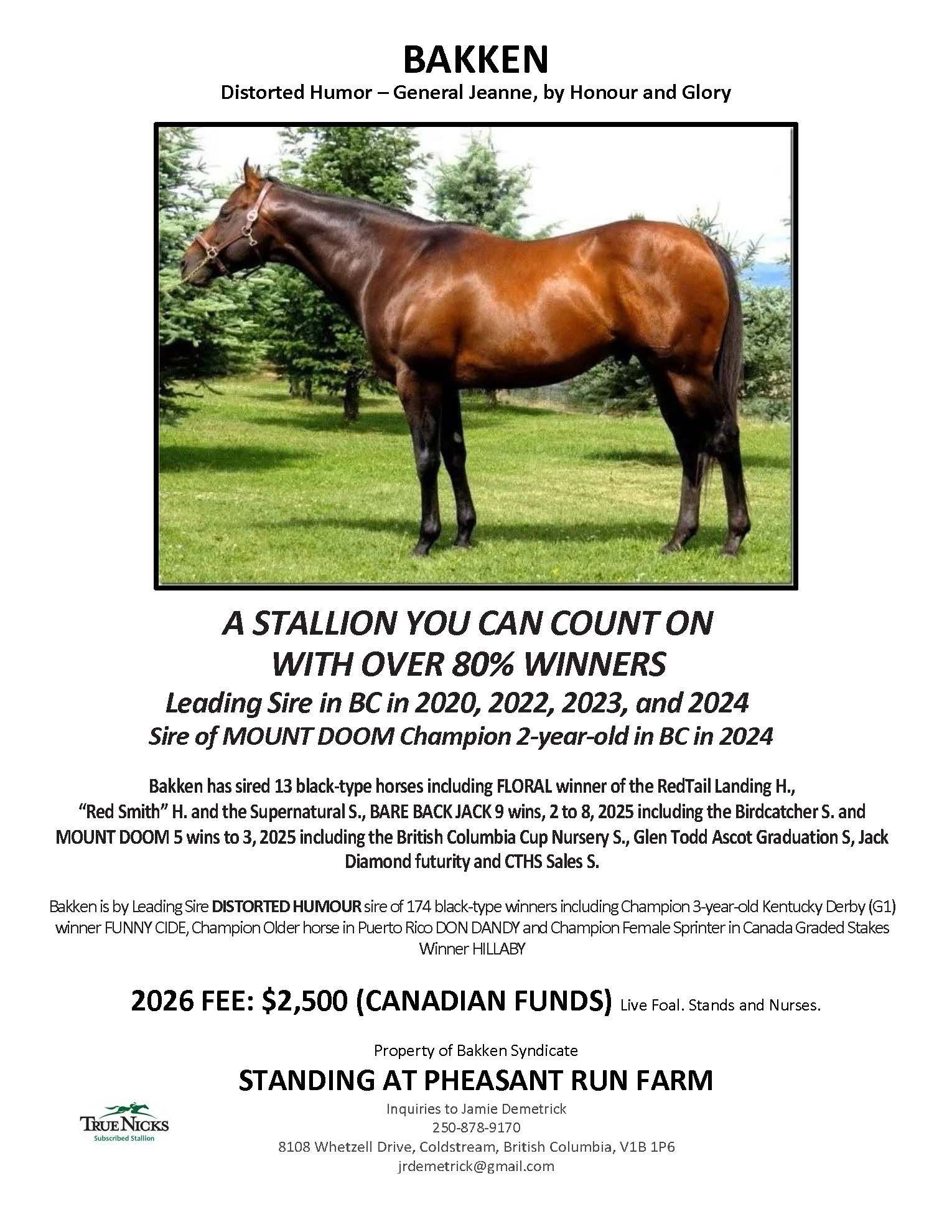 Jamie Demetrick and Allison Covert are excited to have Bakken standing at Pheasant Run Farm in Coldstream BC. Bakken was Leading Sire for 2020, 2022, 2023 and 2024. For more information visit pheasantfarmrun.ca and www.cthsnational.com/stallion-directory